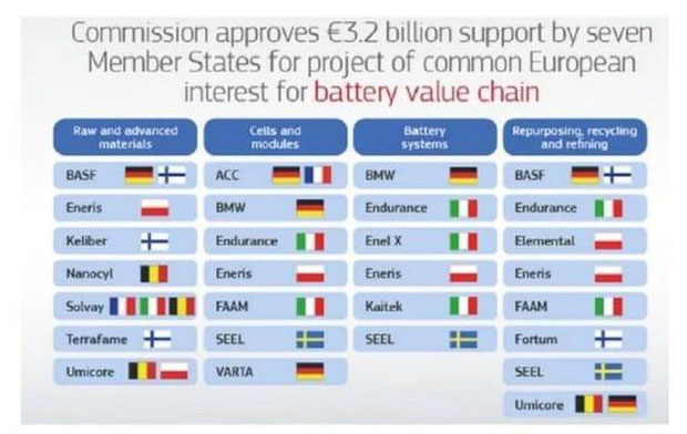歐盟委員會表示,歐盟認為電動汽車電池制造業(yè)對歐洲具有戰(zhàn)略意義。為此,歐盟共批準32億歐元(249億元人民幣)支持德國、法國、意大利、比利時、芬蘭、波蘭和瑞典七個歐盟國家的電動汽車電池技術(shù)研發(fā)和生產(chǎn)項目。