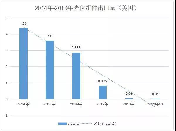于2018年1月22日通過的201法案,對光伏電池片和組件在既有反傾銷與反補貼稅率基礎(chǔ)上增加201關(guān)稅,稅率為30%,接下來4年每年遞減5%,每年有2.5GW的進口電池片或組件擁有豁免權(quán)。201法案最少實施4年,最多可以延長至8年,由于跟雙反稅疊加后,中國制造的光伏電池和組件稅率高達80%以上,近幾年,中國出口至美國的組件下降非常明顯。