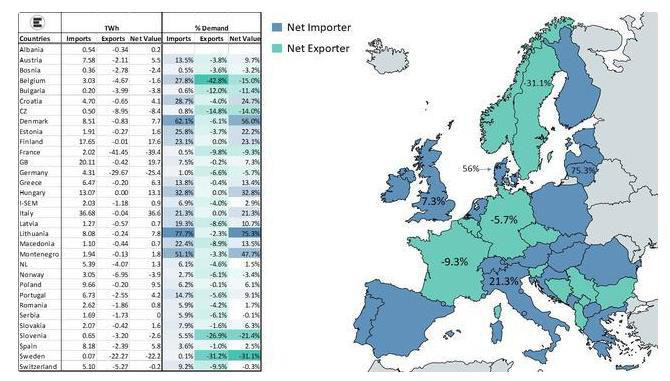 然而,如果考慮到凈出口占需求的百分比,法國和德國的數(shù)字相對較低(分別為9.3%和5.7%)。瑞典(31.1%)和斯洛文尼亞(21.4%)在此期間的凈出口占需求的比例最大,盡管后者的凈流出量相對較低(2.6twh)。