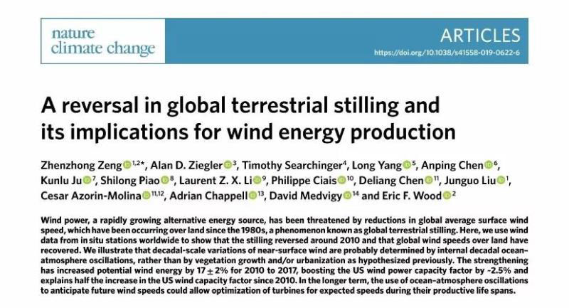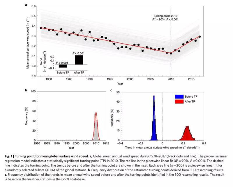 中外學(xué)者在《自然·氣候變化》雜志上發(fā)表文章,指出自2010年左右以來(lái),北美、歐洲和亞洲大部分地區(qū)的風(fēng)速一直在加快。在過(guò)去不到十年的時(shí)間里,全球平均風(fēng)速已從約7英里/小時(shí)(mph)增至7.4英里/小時(shí)。對(duì)于普通的風(fēng)力發(fā)電機(jī)而言,這意味著潛在的風(fēng)能增加了17%。研究人員認(rèn)為,風(fēng)速的增加解釋了自2010年以來(lái)美國(guó)風(fēng)力發(fā)電量增長(zhǎng)的一半左右。