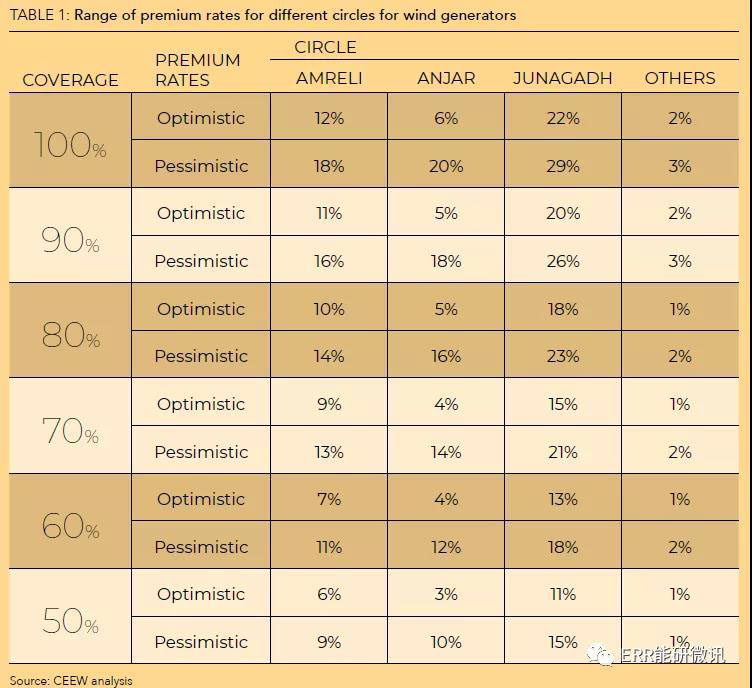 較高的保險費率反映了更高的限電風險。由于電網(wǎng)調(diào)度數(shù)據(jù)僅適用于古吉拉特邦,因此計算了古吉拉特邦GIG用例的費率。太陽能技術的溢價沒有計算,因為目前對太陽能的限電是有限的。風電行業(yè)的溢價率分為四類——Amreli、Anjar、Junagadh和其他(見表1)。其他類別包括所有種類,但列出單獨保費率的三種除外。需要注意的一點是,這些價值只是指示性的,不應被視為提供可銷售工具所需的技術定價的替代。