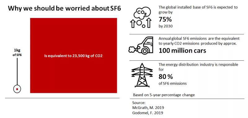 開(kāi)關(guān)設(shè)備是電網(wǎng)的重要組成部分,用于隔離并保護(hù)電網(wǎng)的不同部分。開(kāi)關(guān)設(shè)備技術(shù)已經(jīng)越來(lái)越普及,氣體絕緣開(kāi)關(guān)設(shè)備(GIS)被認(rèn)為是先進(jìn)技術(shù)。但是,這項(xiàng)技術(shù)所含的氣體正是世界上最強(qiáng)的溫室氣體——六氟化硫(SF6),其單分子的溫室效應(yīng)是二氧化碳的2.2萬(wàn)倍。全球SF6中有80%被用作GIS的絕緣介質(zhì),其全球年排放量為約8,100噸,這相當(dāng)于約1億輛新車(chē)每年產(chǎn)生的二氧化碳排放量。此外,SF6大氣壽命至少為1000年。