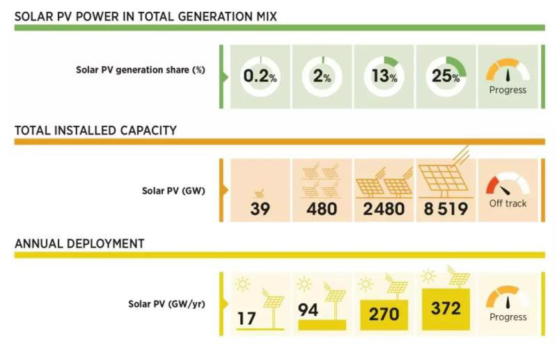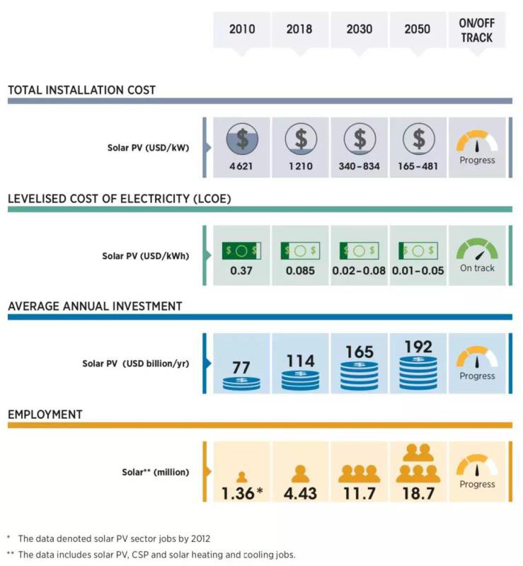 國際可再生能源署(IRENA)發(fā)表“太陽能光伏未來”(Future of Solar Photovoltaic)報告,2050年光伏發(fā)展愿景如下(可再生能源+節(jié)能的REMAP情景分析):