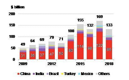 然而,投資額的減少并不僅限于中國。印度和巴西清潔能源項目獲得的資金較上年分別下降了24億美元和27億美元??v觀報告覆蓋的所有新興市場,2018年總投資降至1330億美元,不僅低于2017年,也低于2015年的數字??傮w而言,太陽能和風電成本的降低是新興經濟體投資額絕對值減少的重要因素。