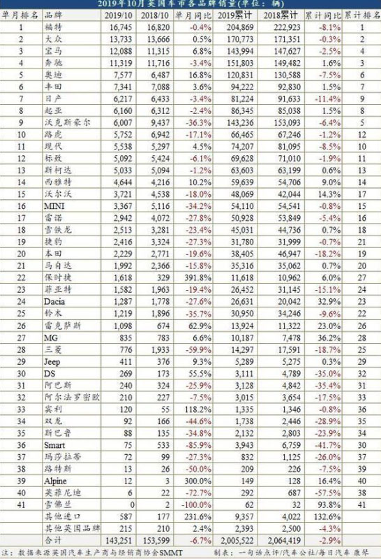 在去年同期下跌20.5%換回今年9月難得的增長后,10月的英國又繼續(xù)恢復(fù)負(fù)增長的本色。根據(jù)英國汽車生產(chǎn)商與經(jīng)銷商協(xié)會SMMT公布的數(shù)據(jù),10月英國乘用車銷量同比下跌6.7%至143,251輛,比去年同期的減少超過1萬輛,這是自2012年以來同期的最低銷量,同時這一表現(xiàn)也使得今年前10月英國的總銷量僅剛剛跨過200萬輛的門檻,為2,005,522輛,同比下跌2.9%。