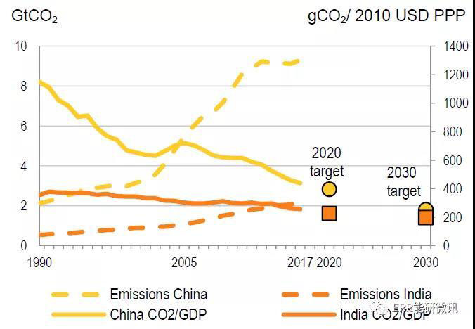 圖14B 中國和印度的歷史二氧化碳排放量(1990-2017)和排放強(qiáng)度降低目標(biāo)(2020、2030)