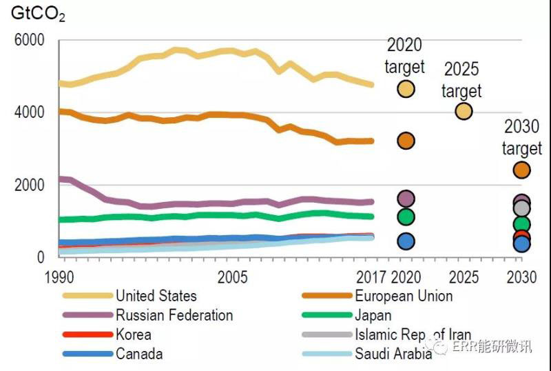 圖14A 前十大排放方(中國和印度除外)的歷史二氧化碳排放量(1990-2017)和減排目標(biāo)(2020、2025、2030)