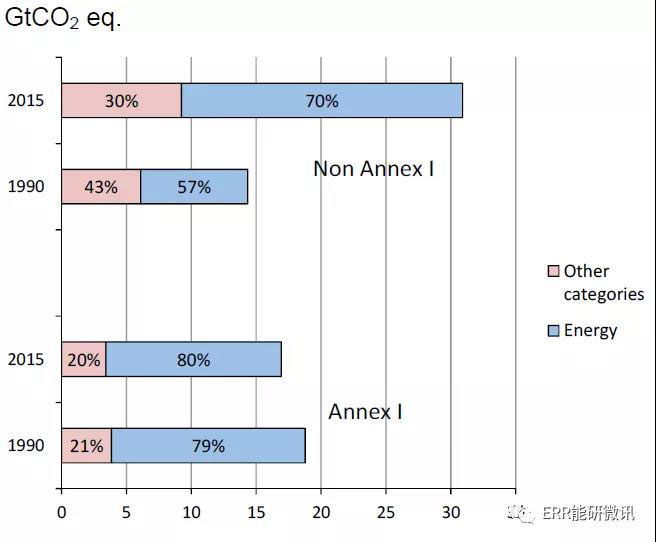 與能源有關(guān)的排放量在溫室氣體排放總量中所占的份額增長,主要是由于非附件一國家增加了能源消費(fèi),2015年與能源有關(guān)的排放量在翻了一番多之后,從占溫室氣體排放總量的57%增長到70%(圖13)。在同一時期,附件一所列國家在能源和其他來源上減少了大約10%的溫室氣體總量。由于約90%的能源相關(guān)排放來自碳的氧化,因而二氧化碳是能源類別的溫室氣體排放的最大來源。