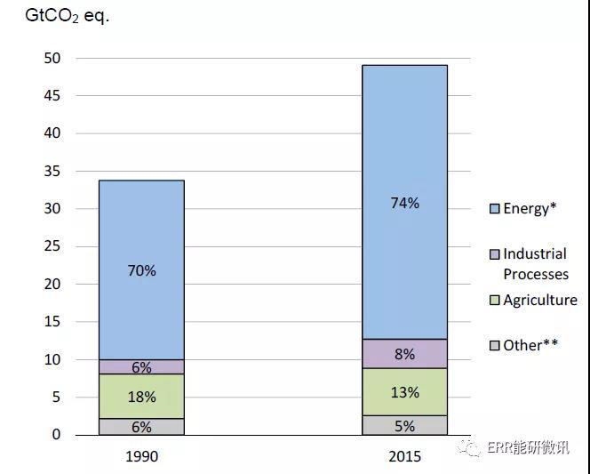 在燃料燃燒產(chǎn)生的二氧化碳排放的推動下,1990~2015年,與能源相關(guān)的溫室氣體排放量增加了12.6億噸;其他溫室氣體來源(工業(yè)過程、農(nóng)業(yè)和其他)加起來增加了2.7億噸(圖12)。