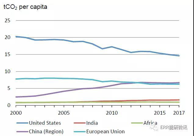 人均排放量不僅存在運(yùn)輸上存在差異,總體上人均排放也存在差異:2017的人均二氧化碳排放量為4.4噸,但全球一半以上的人口排放量低于人均2噸(圖11)。自2000年以來,中國的人均排放量幾乎增加了兩倍,達(dá)到了與歐盟(EU)在20世紀(jì)20年代初相似的水平;雖然人口增長率不到10%,但二氧化碳排放總量幾乎增加了兩倍。2000年至2017年間,印度的排放量翻了一番,但其人均價值仍為歐盟的四分之一。非洲的人均排放量是所有地區(qū)中最低的,約為美國的十分之一,沒有任何增長。如果印度和非洲的人均排放量達(dá)到與歐盟相似的水平,那么大氣中還會釋放出13 億噸二氧化碳(超過當(dāng)前水平的三分之一)。