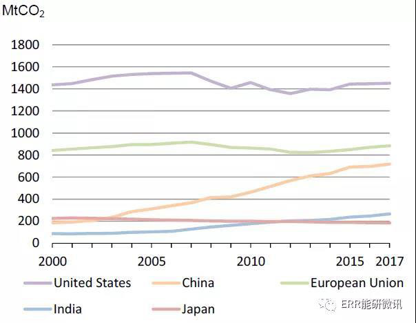 2010~2017年,全球排放量每年增長1個百分點(diǎn),其最主要受到中國(+2.4%)和美國(-1.7%)趨勢的影響,其排放量占比分別為28%和15%。年間,印度每年的增長率均超過了4%。