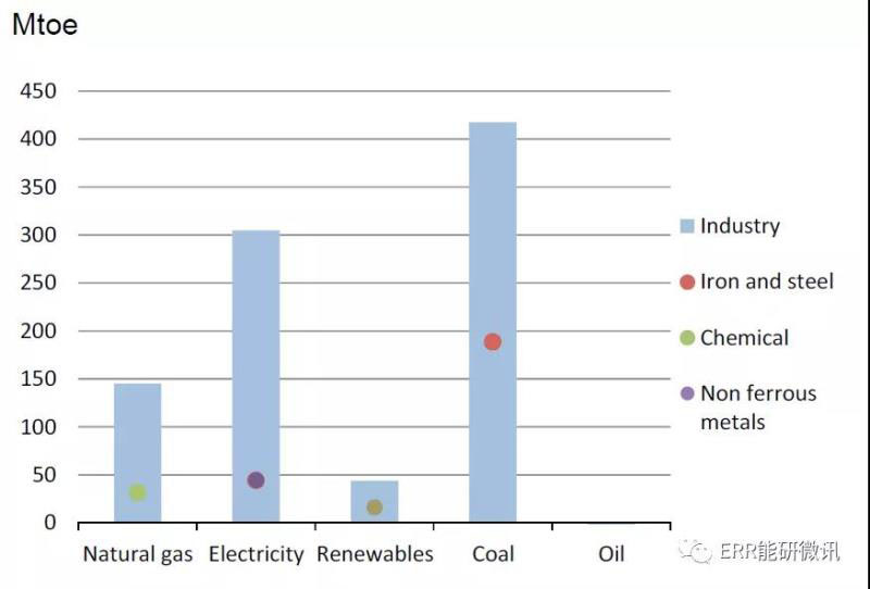 煤炭是鋼鐵和有色金屬行業(yè)的能源需求增長的主要來源;化學(xué)行業(yè)的天然氣消費(fèi)量和煤炭(幾乎完全在中國)都大幅增長,而石油則保持平穩(wěn);所有工業(yè)子行業(yè)的電力都以可比的速度增長。全球范圍內(nèi),僅鋼鐵行業(yè)的煤炭燃燒就產(chǎn)生了20億噸二氧化碳。