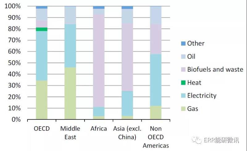 建筑部門是導(dǎo)致電力需求增加的兩大部門之一。但是,盡管全球?qū)﹄娏Φ囊蕾嚩己艽螅鲊g的能源結(jié)構(gòu)存在差異。在經(jīng)合組織中,80%的天然氣消費(fèi)用于供暖、電器、照明和空調(diào)的電力(圖8)。在非經(jīng)合組織國家中,可以觀察到不同的模式:生物質(zhì)的比例通常很高,特別是在非洲和亞洲(不包括中國),特別是傳統(tǒng)的用于烹飪的生物量,通常是不可持續(xù)消費(fèi)的。