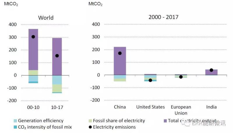 自2000年以來,發(fā)電需求每年增加600太瓦時,這一巨大增長是全球發(fā)電排放量增加的主要驅(qū)動力,同時并沒有被發(fā)電碳強(qiáng)度任何的顯著下降所抵消。由于嚴(yán)重依賴燃煤電廠的亞洲的作用越來越大,所以盡管過去20年大多數(shù)主要生產(chǎn)國的碳排放強(qiáng)度下降,但世界平均水平仍相對持平。2010年后登記的可再生能源普及率和電廠效率的提高,有助于減少單位發(fā)電量的排放,并將2010~2017年的排放年增長率降低到前十年的一半。