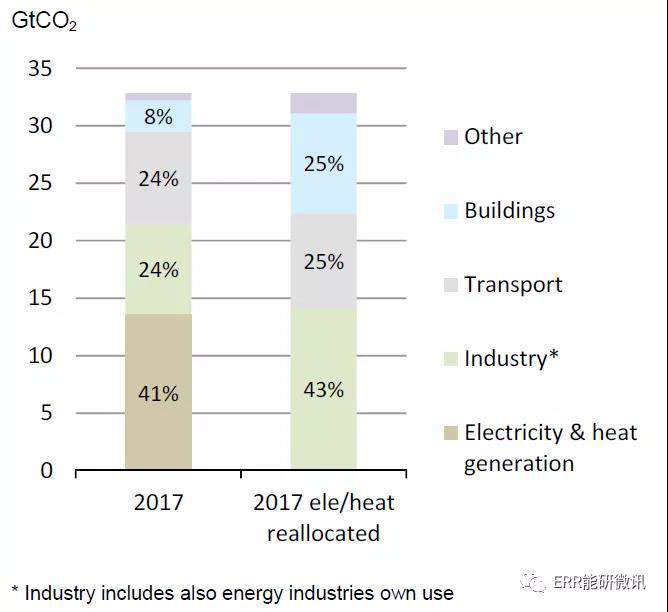 當(dāng)將二氧化碳排放量從發(fā)電部門重新分配到終端部門中時,情況發(fā)生了變化:工業(yè)部門二氧化碳排放量在總排放量中的占比略低于一半,而建筑部門以及運(yùn)輸部門各占1/4。建筑部門消費(fèi)了全球一半的電力(21000太瓦時),另一半則是工業(yè)部門消費(fèi);運(yùn)輸部門在電力消費(fèi)中占比很少。經(jīng)合組織國家建筑部門消費(fèi)量最大,而亞洲地區(qū)則是工業(yè)部門消費(fèi)量最大:由于兩個地區(qū)發(fā)電的碳強(qiáng)度不同,從全球水平上來看,工業(yè)部門間接排放略微上漲。