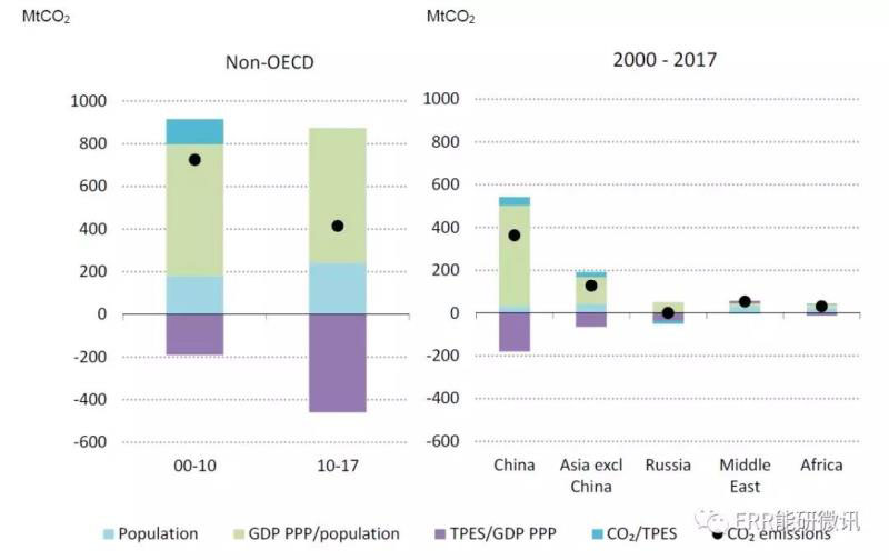 除2013~2016年,自2000年以來非經(jīng)合組織國家二氧化碳排放量出現(xiàn)持續(xù)且穩(wěn)定的增長。經(jīng)濟(jì)產(chǎn)量及人口的增長是該長期趨勢的主要驅(qū)動力;同時,這些國家高度依賴化石燃料也在其中起到重要的作用(圖4)。自2010年后,非經(jīng)合組織國家能源結(jié)構(gòu)的能源效率及碳強(qiáng)度的提升(尤其是中國)導(dǎo)致了排放增長的縮減,但其仍然十分可觀。