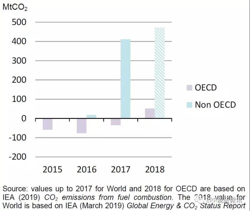 和過去幾年一樣,2017年及2018年出現(xiàn)的增長主要來自非經(jīng)合組織國家,其中主要是東南亞及中東地區(qū)。非經(jīng)合組織國家整體2年表現(xiàn)出來的增速都要高于2%(圖2),2018年總量超過了200億噸。由于非經(jīng)合組織國家二氧化碳排放量的變化超過了經(jīng)合組織國家的十倍,因而非經(jīng)合組織國家的排放水平快速的增長為經(jīng)合組織國家的兩倍。