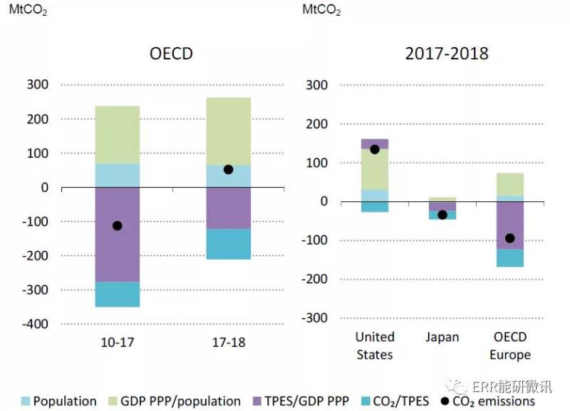 自2013年以來,經(jīng)合組織國家2018年二氧化碳排放量出現(xiàn)了增長,原因很大程度上是由于2018年一次能源供應(yīng)總量的明顯增長,總量達(dá)到了54億噸油當(dāng)量,為2010年來的最高值。其中,天然氣增長最快,在2018年增長了7000萬噸油當(dāng)量;盡管可再生能源出現(xiàn)了增長并且煤炭有所縮減,但是低碳能源還是無法跟上天然氣增長的腳步,進(jìn)而導(dǎo)致二氧化碳排放量增長了0.5%。在經(jīng)歷了2010~2017年年均縮減1%的階段之后,雖然能效有所提升同時可再生能源普及加大,但是經(jīng)濟(jì)產(chǎn)量的增長仍然是經(jīng)合組織國家排放量增長的主要拉動力。與前些年不同的是,能源效率的提升并不能抵消能源需求增長導(dǎo)致的二氧化碳排放量的增加(圖3)。在近年來日本及歐洲保持穩(wěn)定趨勢的同時,美國能源強(qiáng)度在2018年首次出現(xiàn)增長。冬季極端天氣條件侵襲北美或許在其中起到十分重要的作用。