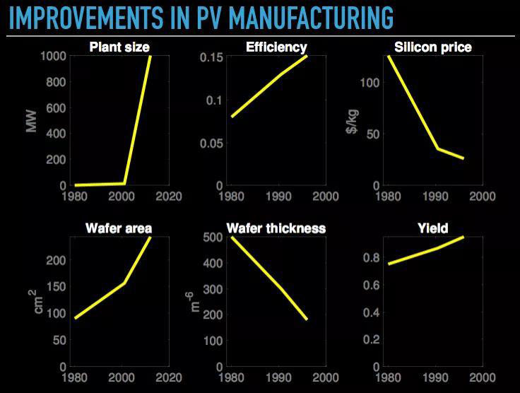 從光伏制造業(yè)技術(shù)發(fā)展來看,光伏電站裝機達到兆瓦級、電池效率的提高、硅料價格的下降、硅片面積的提高、厚度的下降等等都是光伏價格下降的重要因素。