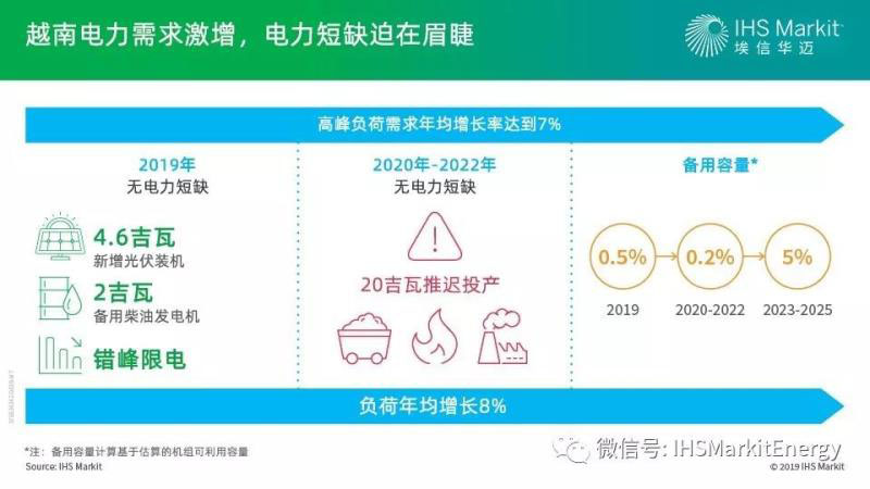 在2019年高溫天氣時段,水庫水位下降導(dǎo)致水電可利用容量銳減的不利條件下,越南仍成功避免了電力短缺的局面。這要歸功于三點。首先,EVN公開呼吁居民和企業(yè)節(jié)約用電;其次,EVN動用了約2吉瓦成本高昂的柴油發(fā)電;第三,在2019年6月30日光伏補(bǔ)貼截止日期之前,光伏裝機(jī)規(guī)模大增4.6吉瓦。
