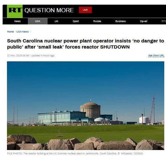 rt稱,這座名為vc summer的核電站位于南卡羅來納州詹金斯維爾(jenkinsville)。幾周前,核電站被發(fā)現(xiàn)冷卻劑泄漏,上周,工程師為修復(fù)被迫關(guān)閉了其唯一的反應(yīng)堆。