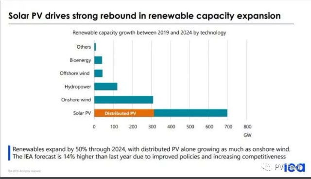 根據(jù)IEA的五年預(yù)測報告,從2019年至2024年,預(yù)計太陽能光伏行業(yè)會新增近700GW項目。根據(jù)IEA的新聞稿,在1200GW新能源項目總量中,光伏占比為60%。