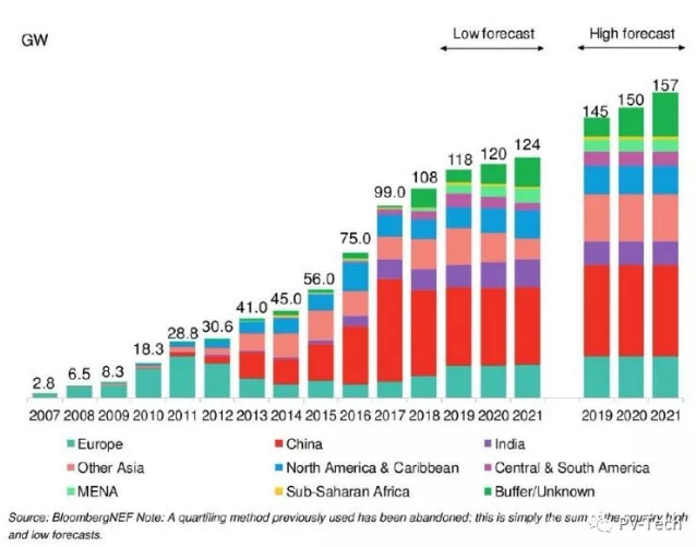 根據(jù)彭博新能源財經(jīng)對2019年二季度的預(yù)測(低預(yù)測值),預(yù)計至2021年,光伏年裝機量不會高于124GW,三年間的平均年裝機量為121GW。