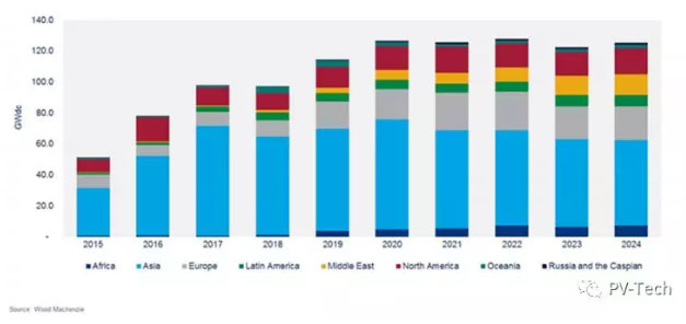 Wood Mackenzie的最新預(yù)測稱,2019年全球太陽能市場將達到114.5GW,較上年增長18%。至2024年,預(yù)計光伏年裝機量將達到120GW-125GW。