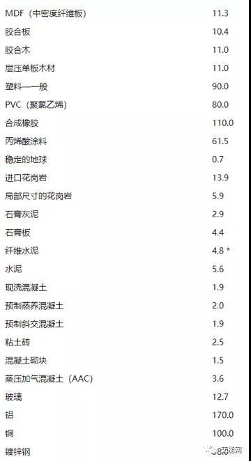 在建筑中,這包括用于提取和加工原材料,制造建筑材料,運(yùn)輸和分配以及組裝和建造所需的所有能源。在計(jì)算隱含能時(shí),還會(huì)把使用壽命期間翻新和維護(hù)基礎(chǔ)設(shè)施,以及在使用壽命結(jié)束時(shí)進(jìn)行拆遷和廢物管理所需的能量包括在內(nèi)。常用建筑材料的隱含能(表示為MJ / kg)如下圖所示。