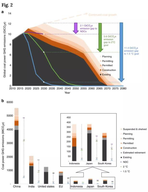 煤電廠一旦建成可以運(yùn)行幾十年。因此,目前正在開發(fā)的煤電項目有可能在整個世紀(jì)產(chǎn)生排放,對實現(xiàn)近期和長期氣候目標(biāo)具有很大影響。具體而言,如果煤電廠在歷史平均壽命(約50年)結(jié)束時運(yùn)行,完成所有擬議項目將導(dǎo)致2030年額外溫室氣體排放量為36億噸二氧化碳。即使沒有新的煤電投產(chǎn),為完成在溫升2°C以下的減排目標(biāo),現(xiàn)存電廠的平均壽命需要減少為35年左右,在溫升1.5°C的目標(biāo)情況下減少為20年。如果在建煤電投產(chǎn),那么相對2°C和1.5°C的目標(biāo)煤電廠的運(yùn)行壽命限制將減少5年;如果所有擬建煤電項目都建成,所有煤電廠的運(yùn)行壽命限制將再減少10年。