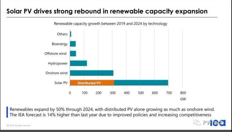 根據(jù)IEA的五年預(yù)測報告,從2019年至2024年,預(yù)計(jì)太陽能光伏行業(yè)會新增近700GW項(xiàng)目。根據(jù)IEA的新聞稿,在1200GW新能源項(xiàng)目總量中,光伏占比為60%。
