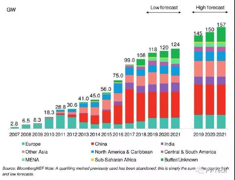 根據(jù)彭博新能源財經(jīng)對2019年二季度的預(yù)測(低預(yù)測值),預(yù)計(jì)至2021年,光伏年裝機(jī)量不會高于124GW,三年間的平均年裝機(jī)量為121GW。