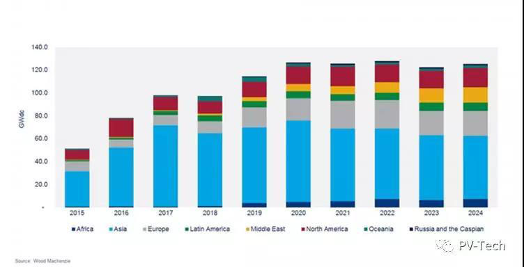 Wood Mackenzie的最新預(yù)測稱,2019年全球太陽能市場將達(dá)到114.5GW,較上年增長18%。至2024年,預(yù)計(jì)光伏年裝機(jī)量將達(dá)到120GW-125GW。
