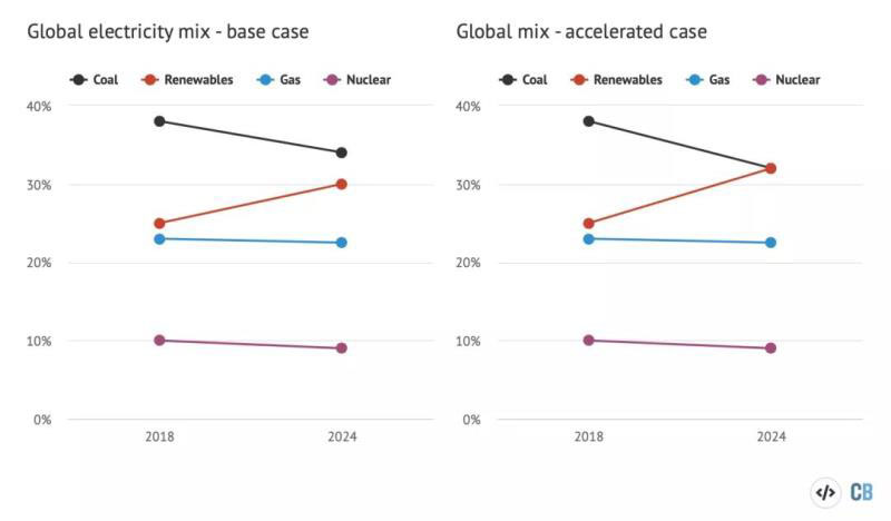由于大部分需求增長(zhǎng)將由可再生能源來(lái)滿足,它們將在全球電力結(jié)構(gòu)中占據(jù)越來(lái)越大的份額。在“基本情況”下,可再生能源(紅線)的份額將從目前的25%增加到2024年的30%,五年內(nèi)增加5個(gè)百分點(diǎn)。這在很大程度上是以煤炭(黑線)的減少為代價(jià)的,后者將下降到混合能源的34%,但仍將是全球電力供應(yīng)的最大貢獻(xiàn)者。在“加速發(fā)展”的情形下,2024年可再生能源發(fā)電將達(dá)32%,與煤電持平。