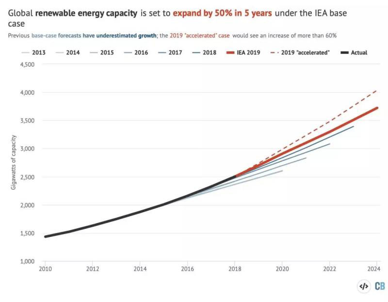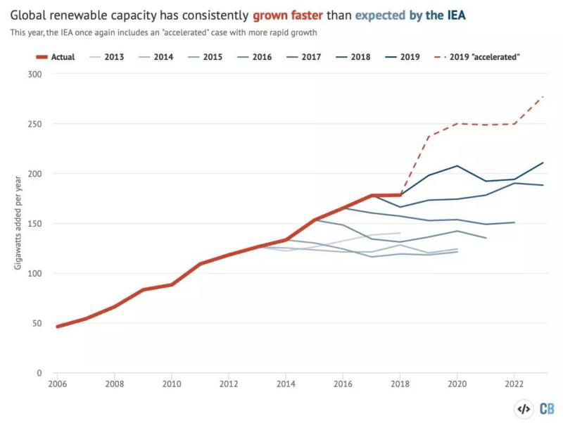 值得注意的是,正如上圖所示,IEA的“基本情況”預(yù)測(cè)在歷史都低估了增長(zhǎng)速度。這一次IEA在其2019年預(yù)測(cè)中還包括了“加速發(fā)展”(accelerated