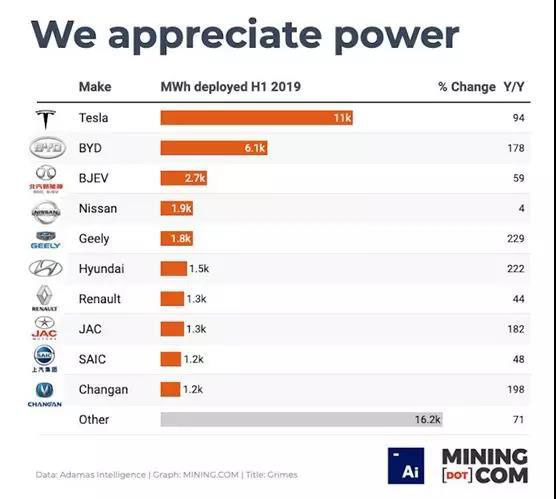 數(shù)據(jù)顯示,2019年上半年,特斯拉在全球共交付了15.82萬(wàn)輛汽車,實(shí)現(xiàn)動(dòng)力電池裝機(jī)電量約11GWh,成為全球最大的動(dòng)力電池裝機(jī)車企。預(yù)計(jì)特斯拉全年動(dòng)力電池裝機(jī)電量將超過(guò)22 GWh。