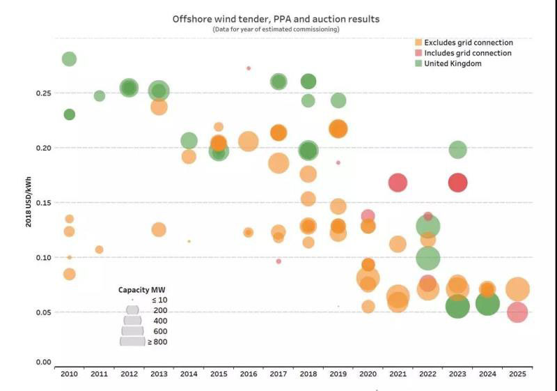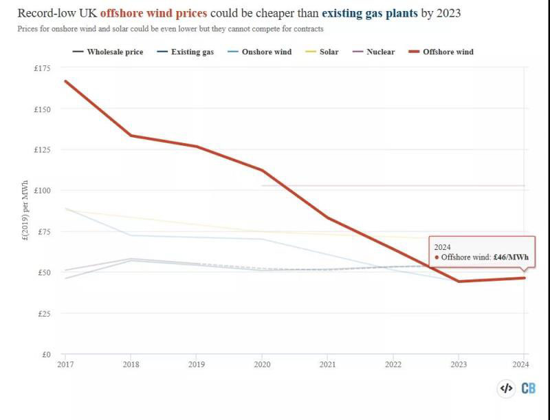 中國儲能網(wǎng)訊:2019年9月20日,英國6個海上風電場(總計5.5GW)競標結果揭曉,報出創(chuàng)紀錄的低價:2023/24年開始運營的項目的價格為39.65英鎊/兆瓦時(按2012年價格,按通貨膨脹調整后為44英鎊/兆瓦時),而2024/25年的項目為41.61英鎊/兆瓦時。這些價格比政府的“參考價格”低8-9英鎊/兆瓦時,意味著這些新的海上風電場還將比現(xiàn)有的燃氣發(fā)電站更便宜地發(fā)電。預計這些海上風電項目每年將生產約290億千瓦時(29TWh)的電力,相當于英國2018年總發(fā)電量的9%,足以為英國2600萬戶家庭中的四分之一供電。按照英國的電力市場機制和市場趨勢,這些風電項目不但會收取任何補貼,反而會在2017年前向消費者回饋近6億英鎊。
