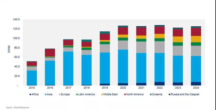 Wood Mackenzie還預(yù)測(cè)了2019年全球太陽(yáng)能市場(chǎng)將比2018年增長(zhǎng)18%,達(dá)到114.5GW的新高,到2024年,全球年新增裝機(jī)量將突破120GW至125GW。
