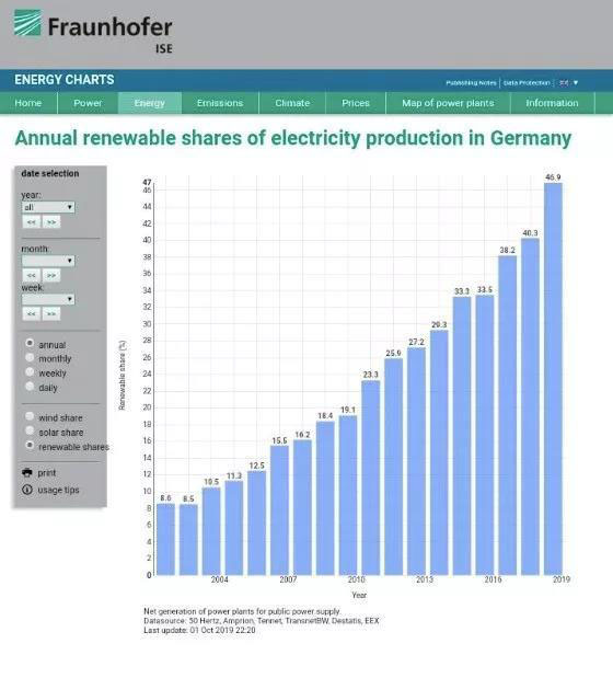 根據(jù)德國Fraunhofer Institute for Solar Energy Systems匯總的數(shù)據(jù),2003年德國可再生能源發(fā)電占比僅為8.5%,2010年達(dá)到19.1%,2015年達(dá)到33.3%,2018年達(dá)到40.3%。而2019年前9個月可再生能源發(fā)電占比已經(jīng)達(dá)到46.9%(風(fēng)電23.2%、太陽能10.8%、生物質(zhì)8.7%、水電4.1%),同期煤電占比29.0%、天然氣發(fā)電10.2%、核電13.4%。