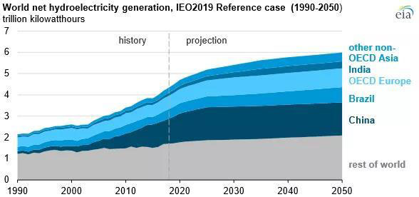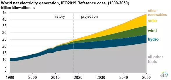 中國儲能網(wǎng)訊:2018年全球28%的電力來自可再生能源,其中大部分(96%)來自水電、風能和太陽能技術。美國能源信息署(EIA)日前發(fā)布《2019年國際能源展望》預測可再生能源(包括水力發(fā)電)是2018年至2050年期間增長最快的發(fā)電來源,平均每年增長3.6%。到2050年可再生能源將占全球總發(fā)電量的49%。