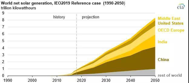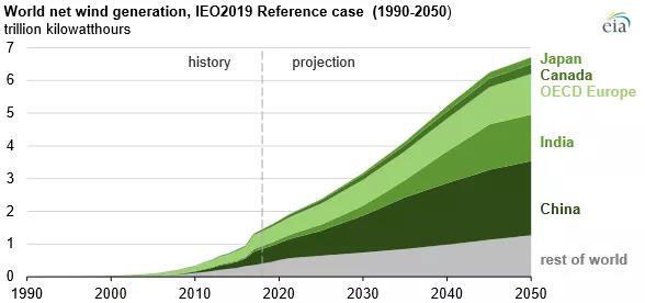 ——在可再生能源中,風能和太陽能的發(fā)電量在2018年至2050年之間增幅最大,分別達到6.7萬億和8.3萬億千瓦時;到2050年,風能和太陽能占可再生能源發(fā)電總量的70%以上。