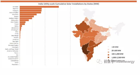從項目分布地區(qū)上看,印度大型地面電站項目主要集中在印度西南部及南部地區(qū),前十大州幾乎包攬了印度全部大型項目裝機量。