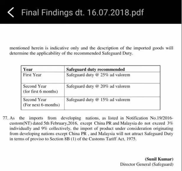 2021年4月1日 開始對光伏組件加征10%,自2022年1月1日起提高到20%,到2023年將加征30%的保障稅;2022年1月1日起對所有進口電池片加征15%,自2023年1月1日起提高到30%的保障稅。(文中還提到為了振興“印度制造”對光伏產品其他原材料如硅片、EVA、玻璃、銀漿、鋁邊框等暫不征保障稅)。