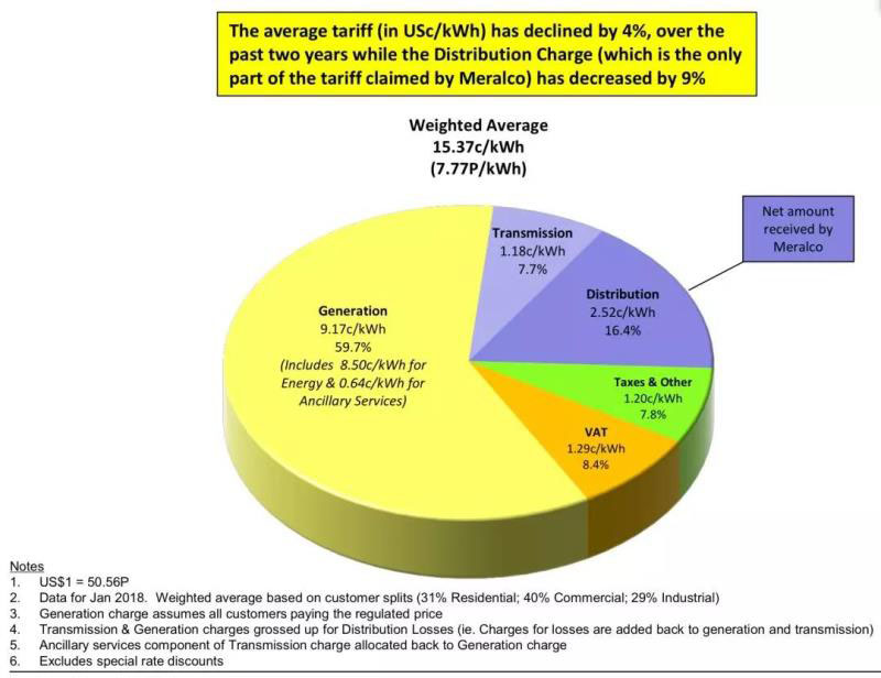 此外,作為配電和售電公司,Meralco還特意聲明在馬尼拉的電價(jià)中,發(fā)電成本價(jià)占59.7%(9.17美分/千瓦時(shí))、輸電占7.7%(1.18美分/千瓦時(shí))、配售電占16.4%(2.52美分/千瓦時(shí)),以及各種稅費(fèi)占16.2%(2.49美分/千瓦時(shí))。