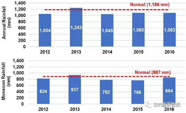 3.水供應下降。印度各地的地下水位正在下降。自2012年以來,全國年降雨總量和季風降雨量均低于正常水平(除2013年外)。這是對煤電生產的一個重大威脅,煤電生產需要大量的水用于蒸汽生產和冷卻,而且由于水供應已經導致多個電廠多次發(fā)電量下降。
