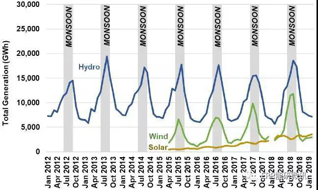 2.來自低成本可再生能源與煤電之間的競爭日益激烈,特別是在季風季節(jié)。由于可再生能源愈發(fā)廉價,在與之的競爭中,煤電在印度能源市場上越來越缺乏競爭力。在季風季節(jié),低成本的可再生能源具有特別的優(yōu)勢。風能和水電可以對煤電發(fā)電量驟降的情況進行補充,提供了一個抵消峰值。