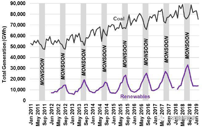 印度煤電和可再生能源(水電、風能和太陽能)總發(fā)電量(GWh)