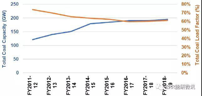 印度煤電總裝機容量(GW)及電廠負荷因數