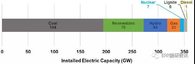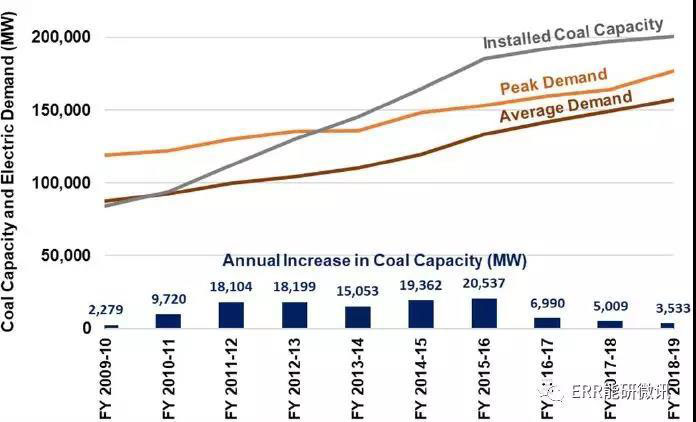 1.煤電裝機的過度建設。最近10年的前5年中,印度煤電建設出現了“熱潮”;盡管本次“熱潮”目前已經結束,但是留下了裝機容量嚴重過剩的后遺癥。21世紀第一個10年的建設熱潮非常明顯,事實上,目前印度的煤電裝機容量比該國的峰值需求水平高出20%,比平均需求水平高出整整50吉瓦(GW)。