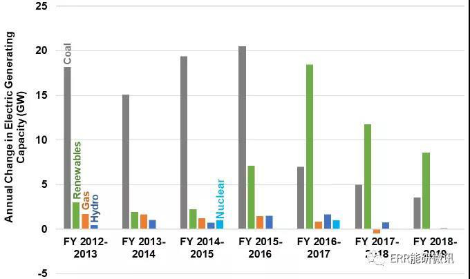 印度年度裝機容量變化,按來源劃分(從2012~2013財年到2018~2019財年)